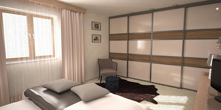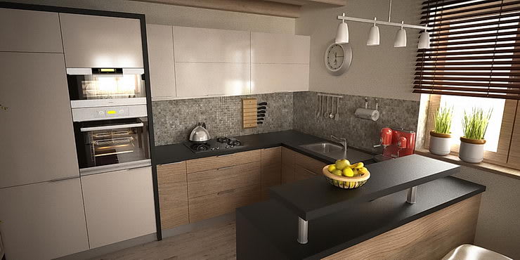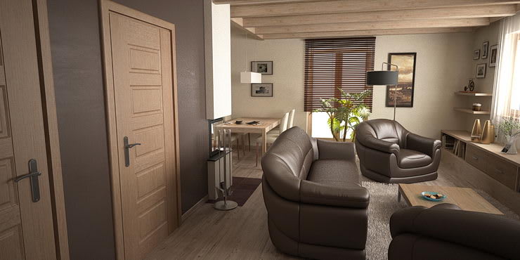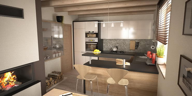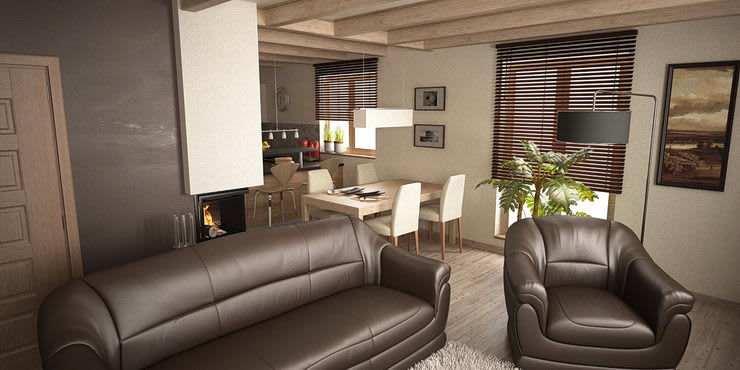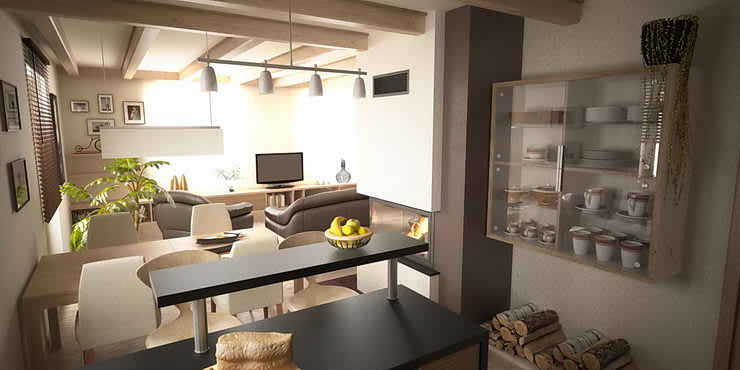 Otvorený priestor dennej časti domu je riešený s prízvukom na drevené povrchy. Sú použité dýhované materiály. Strp je umocnený akcentom na priznané drevené trámy..